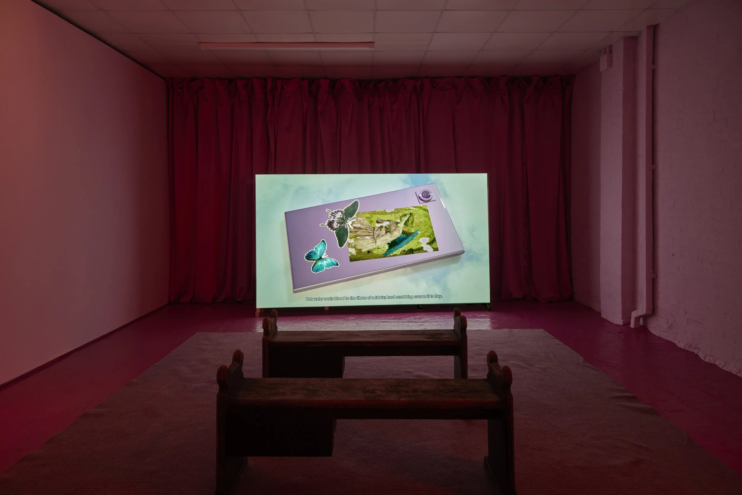 Through the artists’ shared, hyper-feminine aesthetic, which references video games, Y2K, and Catholic regalia, the show explores “the pervasive nature of British Imperialism throughout 20th century Ireland, upheld by the binds of the Catholic Church,” as gallerist Leah Hickey puts it.