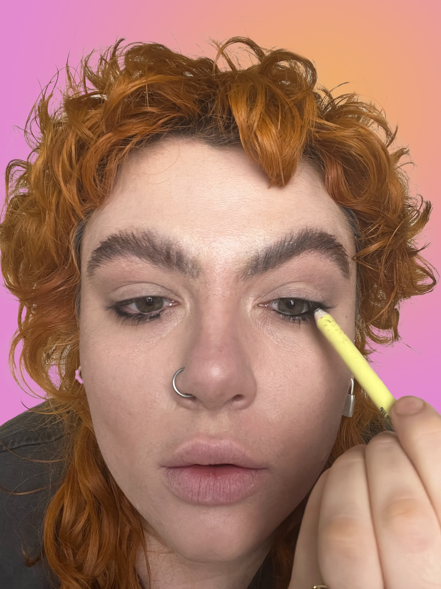 To tightline (apply liner to your top waterline), aim your pencil upwards and close your eyes around it. This feels weird and looks torturous, but it works and is going to add depth from the very base of your lashes.