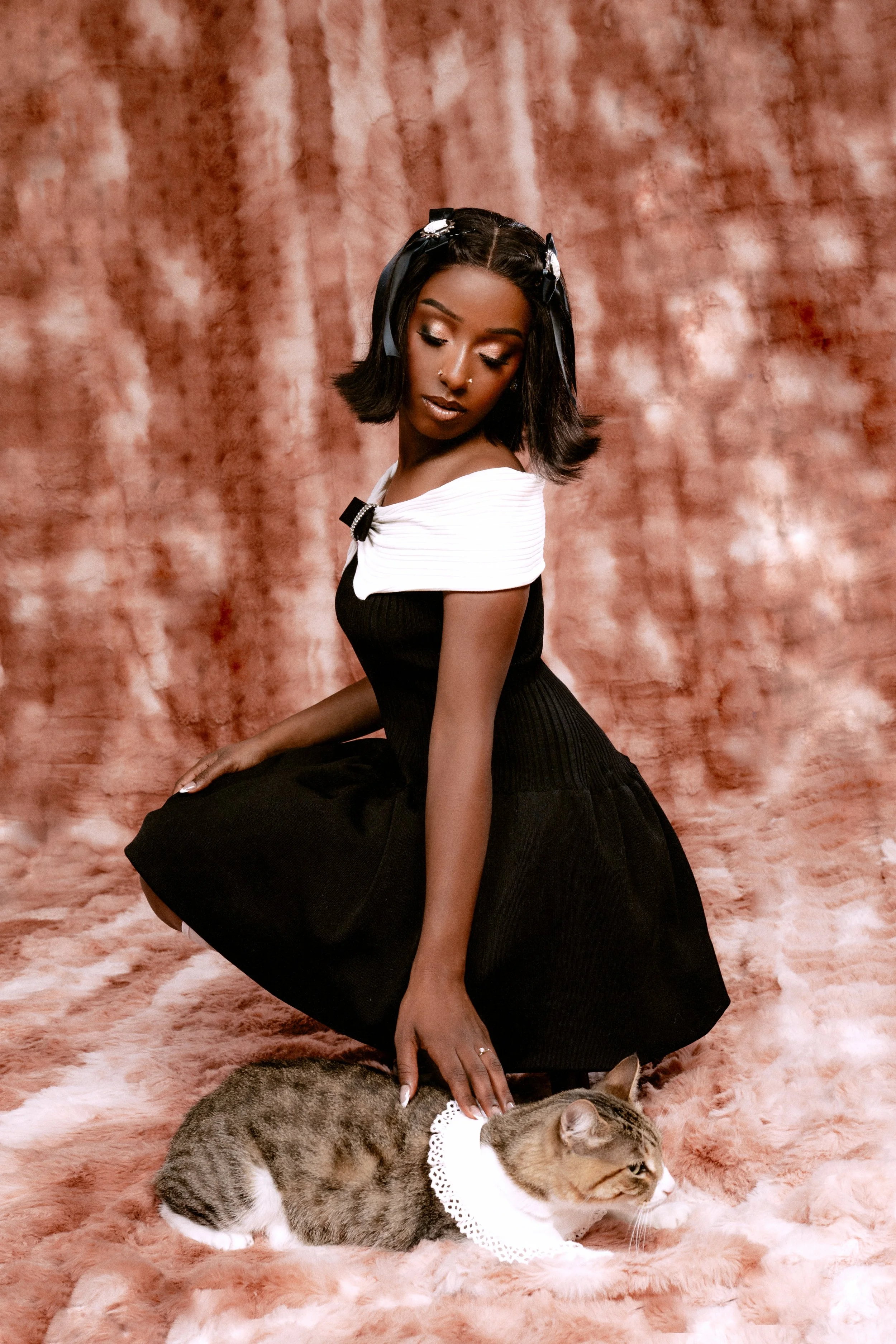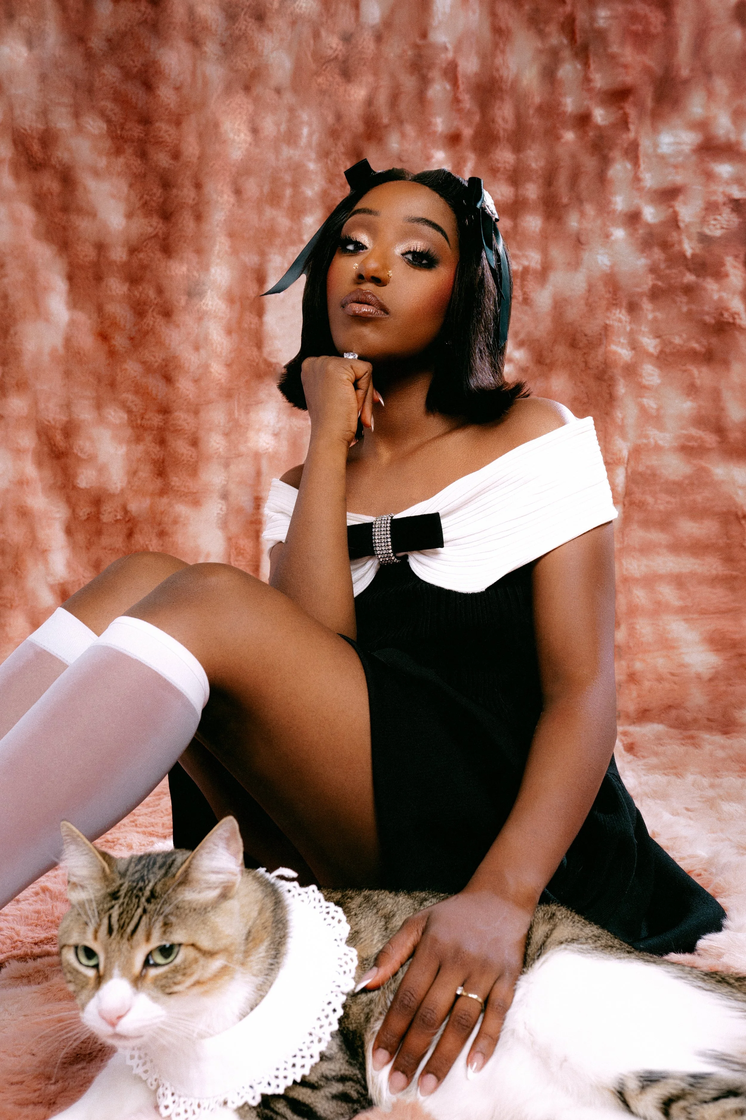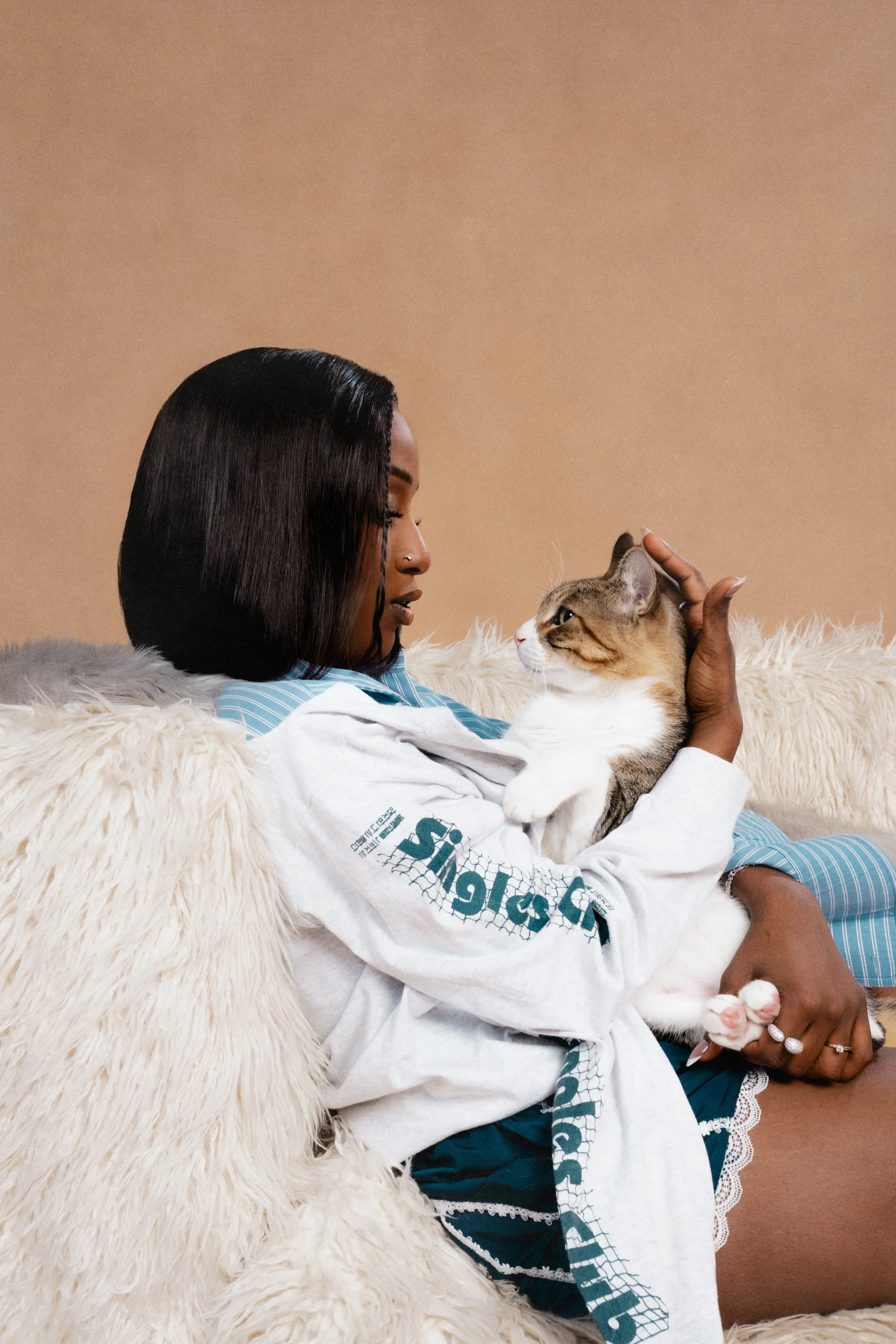 Alemeda is giving me cat tips — “did you try the plug-in pheromone?”. Her cats, Mr. Cinnamon and Mr. Truffles, aren’t blood brothers but cuddle as if they had been together since the womb. My cats are more into hissing spats than Instagrammable snuggles. Mr. Cinammon is the only feline present at Polyester’s shoot as Mr. Truffles is a rescue and gets spooked easily. Cinnamon’s happy to pose and follow his mother obligingly, “I could bring him on tour and he’d be fine” she says.