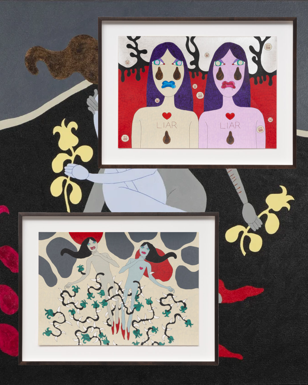 As Goring tells us in ‘Plague Fields’ this is work that could be defined through an inexplicable yearning. Goring’s art seems to yearn not for something as simple as aesthetic beauty – or a world where beauty in a vacuum can be enough – but for the possibility of a world where terms like this can be redefined; where something new and unseen might be lurking behind a pastel smokescreen, or red, theatrical curtains. Goring always seems to be reaching towards some great perhaps, outstretched hand forced back down by the brutal truth of the world as it is, offering us, instead of some easy alternative, an understanding of how we might be able to craft our own ways out.