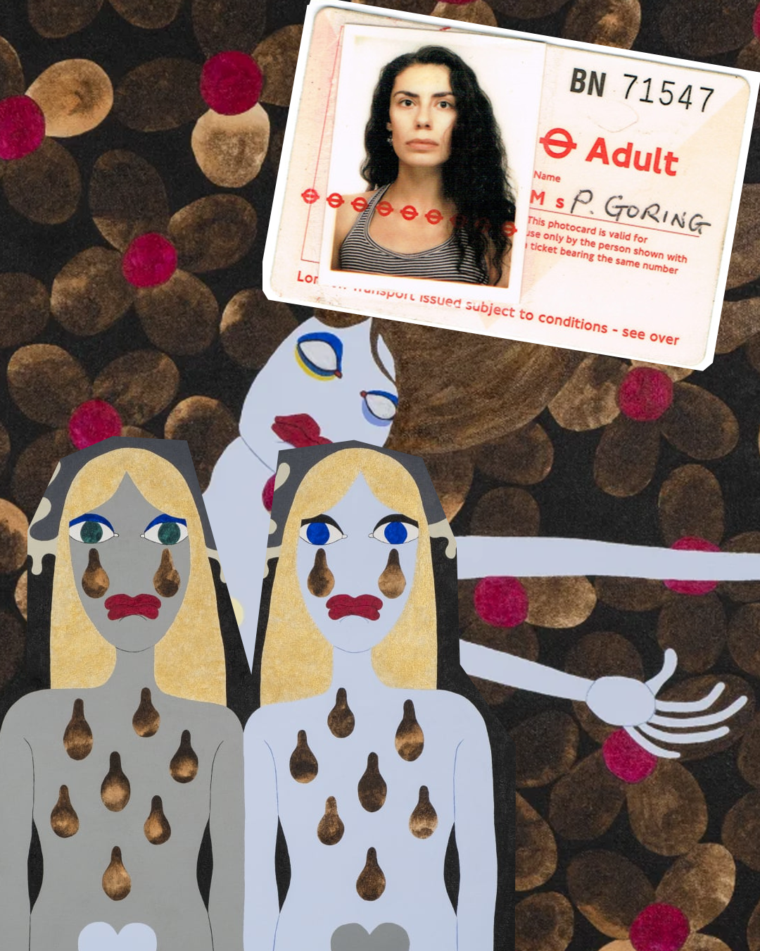 There’s something visceral in Goring’s practice; not just in the ideas and imagery that she creates but in the way that the art itself is made. Goring’s superimposing of her own face onto the bodies of others seems to carry with it the stitches of her MS Paint surgery; in ‘Plague Fields’ the space where one face overlaps with another is clearly seen; a sign of the artist’s hand and her desire to intervene into the world. The two faces in Piggy, an image that vibrates somewhere between erotic desire and the threat of violence, exist in stark contrast to the negative of the image that they’ve been superimposed on.