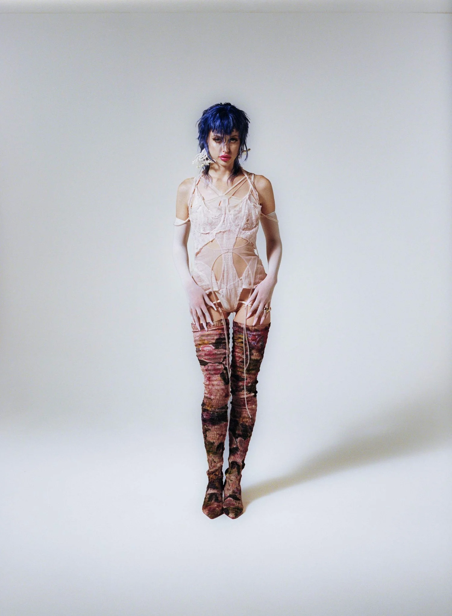 Look 1: Flower earring: 1 Concept | Butterfly bra: Masha Popova | Trouser: Stylist own | Boots: Shuting Qiu || Bangles: Stylist own | Flower rings: Chews
