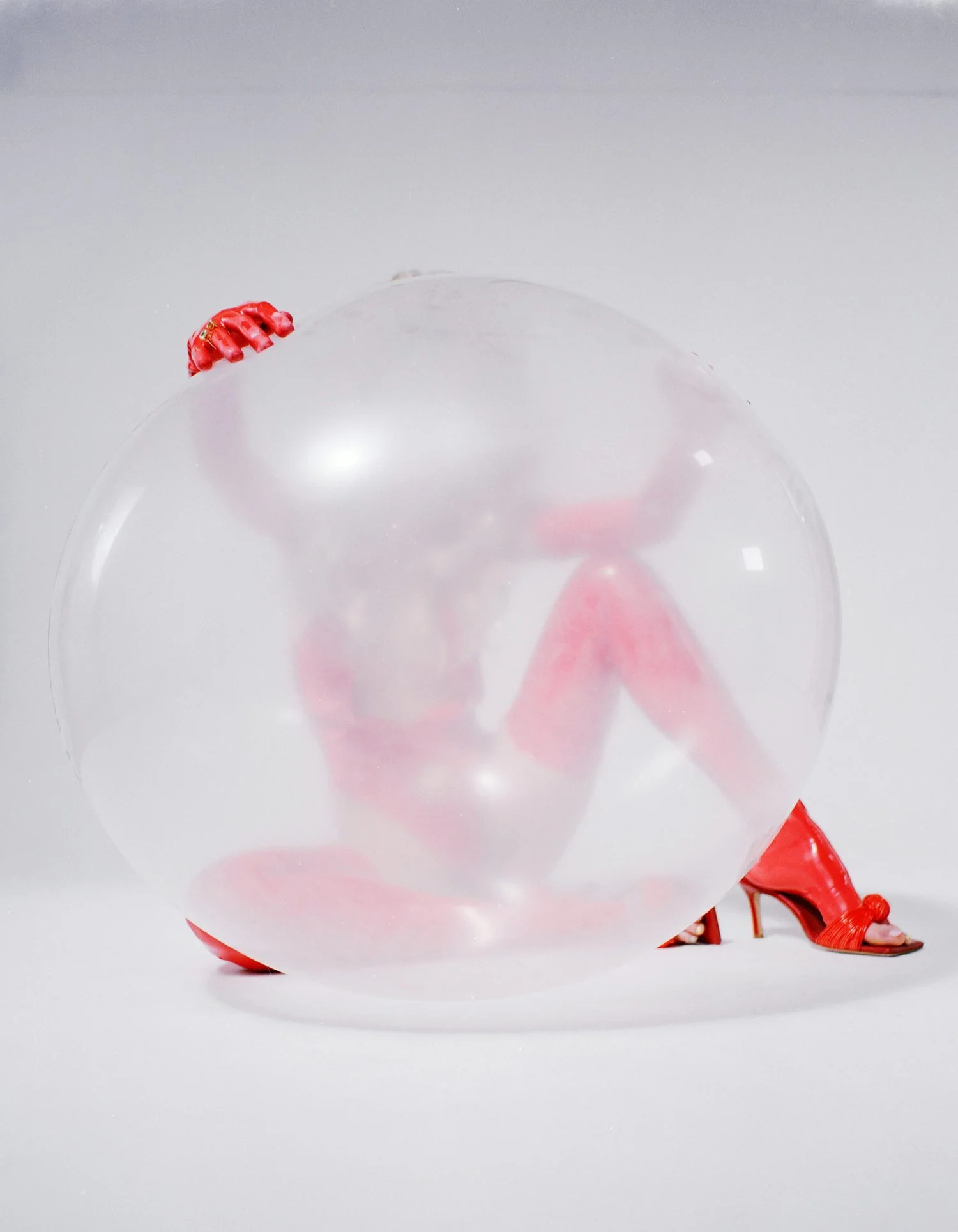 Look 12: Flower hair accessory (earring worn as hair accessory): Tétier | Latex body: Elissa Poppy Latex | Pull ups: Elissa Poppy Latex | Gloves: Elissa Poppy | Rings: Swarovski | Earrings: Swarovski | Red heels: 1 Concept