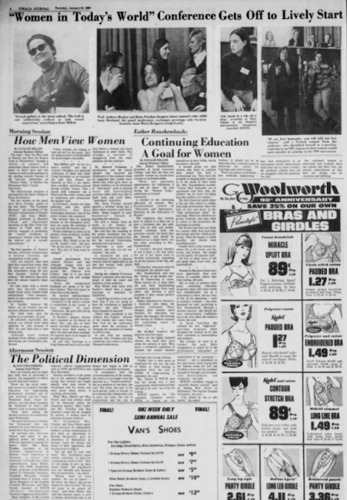 On this cover, Millett is depicted as stern and assertive. Millett's facial expression translates this, she is staring straight at the reader with a resilient and solemn expression; Millett is sitting forward aggressively as if she is prepared to fight. Being stern, or aggressive are qualities often associated with masculinity. On this cover, Time tried to represent Millett as a masculine woman, she is wearing an Oxford shirt, 'a style reminiscent of a middle-class American man.’ This is inconsistent with how Millett presented herself at this time. Between 1960 and 1969, it is difficult to find reports of Millett by mainstream publications, but she is present in local newspapers. The Ithaca Journal, a daily morning broadsheet newspaper published in Ithaca, New York, reported on a WLM conference Millett spoke at with other academics in 1969. A picture of Millett accompanies the article; she is smiling while she speaks to the audience and is dressed in a turtleneck, sunglasses and a stylish waistcoat. A conservative yet identifiably feminine outfit. As the educational chairman of the New York City chapter of National Organization for Women (NOW) and English professor, Millett is speaking at this conference as an educator. As a result, she dressed appropriately for the event. There is little similarity between the Millett painted by Neel and the Millett shown in the Ithaca Journal.
