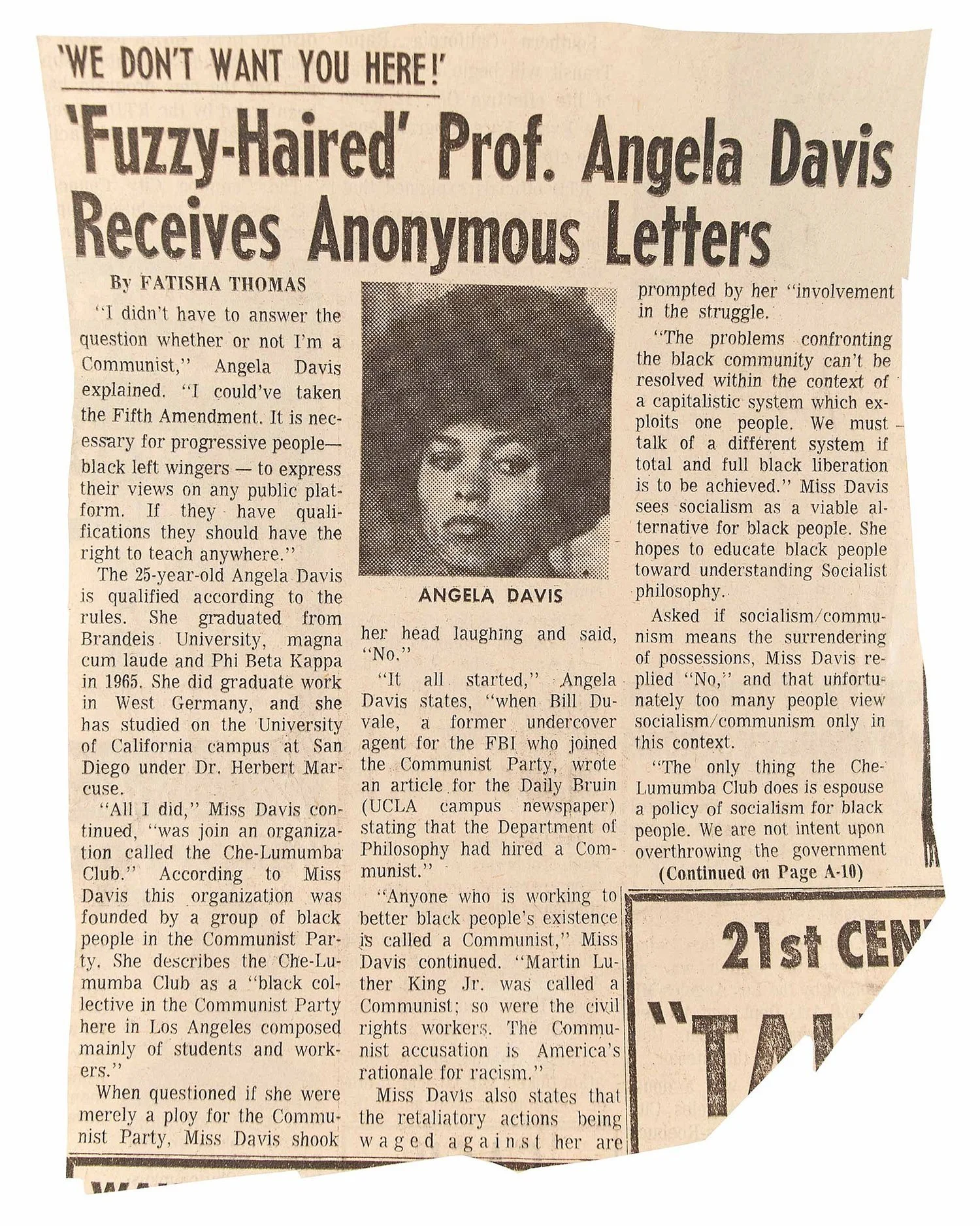 Similarly, mainstream media publications worked to discredit Davis’s intellectualism and activism. Davis did not become newsworthy until 1969, when she was fired from her assistant professor position at UCLA for being a member of the Communist Party USA (CPUSA). Before that, there is little to no coverage of Davis. Once Davis made headlines, her coverage was racially charged. Shortly after Davis was fired from UCLA, the Los Angeles Times wrote an article about Davis titled ‘’We Don’t Want You Here!’: ‘Fuzzy-Haired’ Prof. Angela Davis Receives Anonymous Letters.’ This racialised and gendered headline provided the Board of Regents with justification for firing Davis. Afro-textured hair was seen as unprofessional, unattractive and unclean.