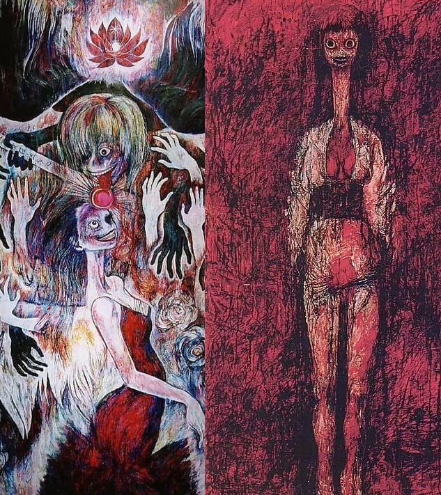 The exact year her work first gained traction is unclear, however, a specific piece titled "I can't be a bride anymore" became a turning point in her recognition. This painting morphed into a popular creepypasta online under the name "Tomino's hell." It claimed the painting was cursed, sparking a wave of online interest and solidifying Tatsushima's place in the digital art world. This painting evokes a macabre fascination, a disturbing yet captivating scene. The bulging eyes, the unsettling grin, and the way the neck stretches out as if it were trying to break free of the body. Her torso is the immediate focus, drawing attention to the bloody crotch and constricting corset that emphasises her breasts. Someone has violated her. Her hands, possibly bound behind her back, hint at a struggle, adding another layer of vulnerability to the scene. The title itself resonates with the harsh reality of rape culture in Japan, where victims are often silenced and rape remains a taboo subject.