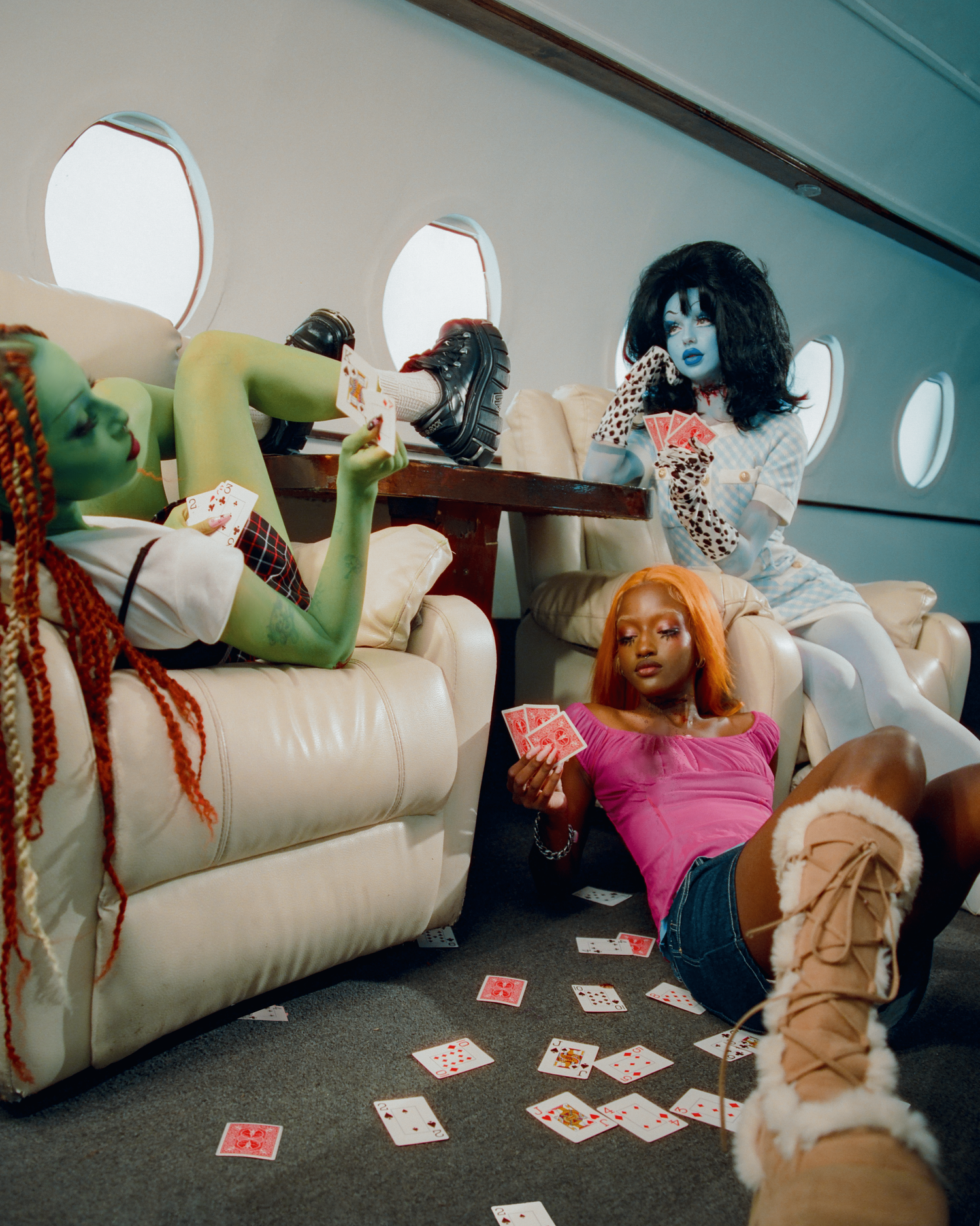 Three young people sit in a dimly lit plane, playing cards while awaiting arrival to their final destination.