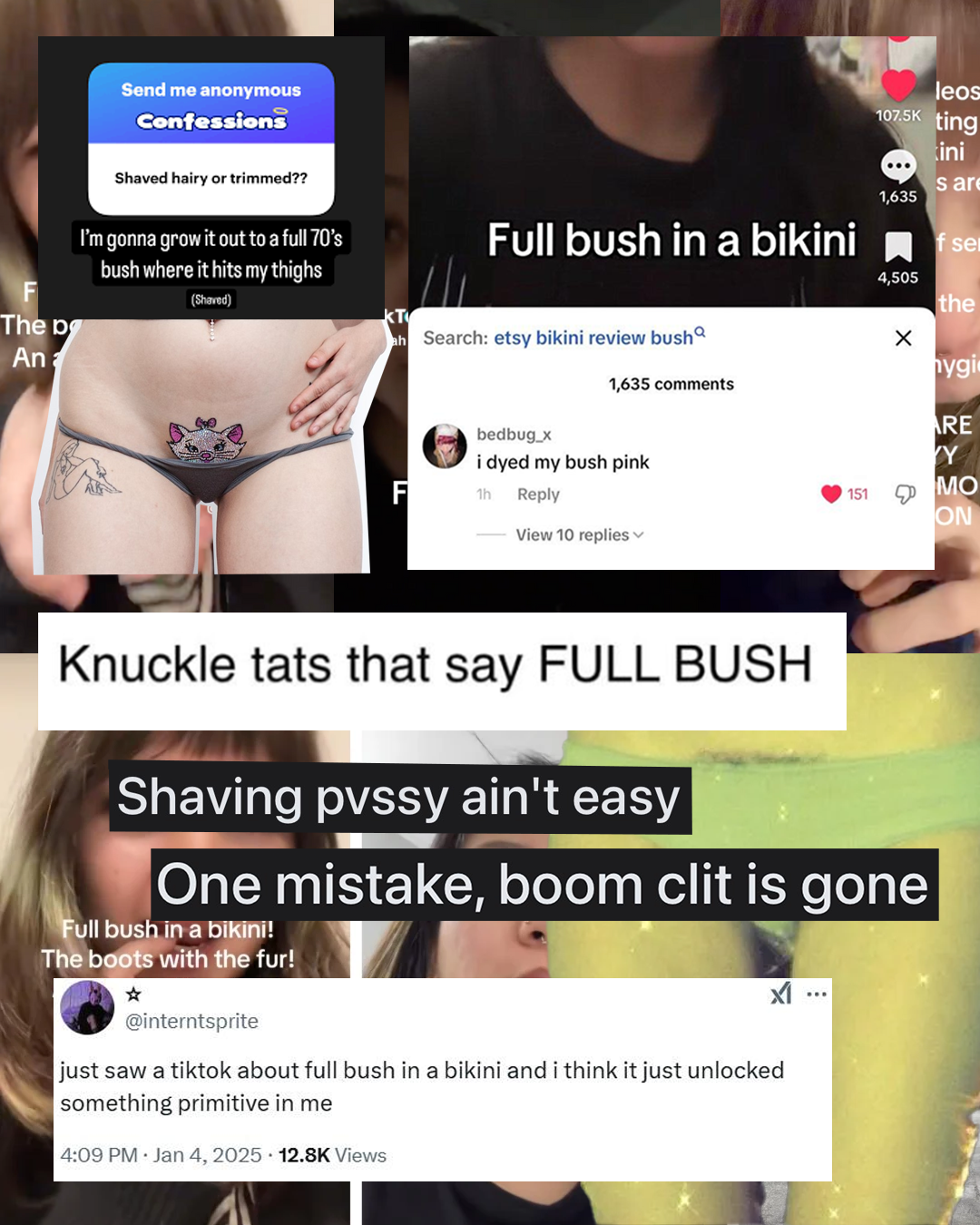 In TikToks of women in public places that are captioned “no one here knows I'm full bush in a thong right now”, bush operates as a way for individuals to retain a sense of bodily autonomy in a culture that’s constantly seeking to repossess it. Even when maybe adhering to a more conventional expression of femininity, like wearing traditionally sexy underwear, a full bush affords cis women the chance to subvert gender optics and claim a sense of personal control and power - even just secretly to oneself.