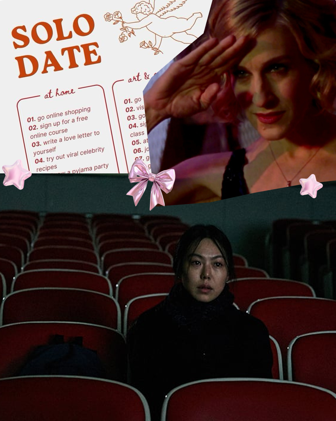 Our cultural landscape is struggling with and appealing to alienation in every sense of the word, from feelings of powerlessness under hegemonic and institutional powers, to estrangement from others, and the self. Exacerbated by the simultaneous stage-and-audience of social media, this unease is evergreen. In the Sex and the City episode “Anchors Away,” Charlotte reacts in disbelief when Carrie gushes over her day out with herself, including movie-watching at The Paris Theater.