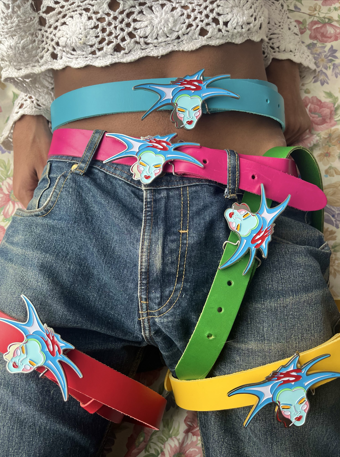 She is a multitalented triple-threat - illustrator, tattoo artist and designer - with a penchant for the colourful, whimsical, and oneiric, and some cool collaborations tucked under her snazzy belt. Her portfolio includes designing for Graam and Puma, and more recently working for London-based brand Alive x More. But her latest venture is perhaps her most audacious yet: a colourful collection of leather belts, manufactured by a small local company called Maison Garot. I am particularly thrilled to find out about the inspiration behind them – turns out she had to pull a Henry VIII and behead some of her own beloved creations: the buckle is the face of a Harlequin/Joker-esque character inspired by Commedia dell’arte (an early form of theatre also known as Italian comedy).