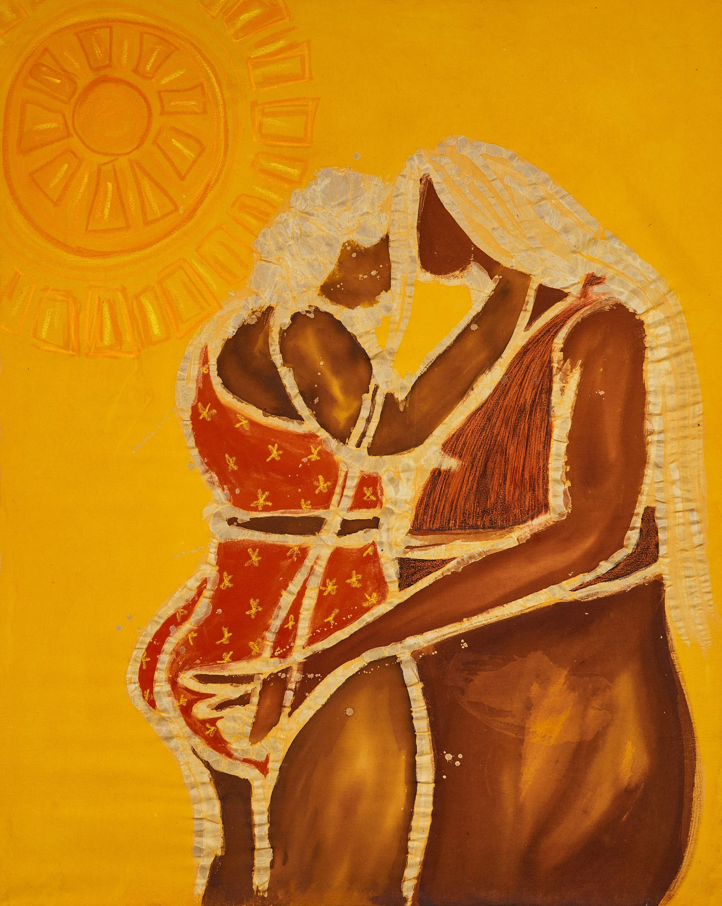 Her paintings are layered, often over previous iterations – building texture is an integral part of her process, incorporating the odd paint splatter or wax spot into a composition like a sign of life. Olulode’s fusing of materials – dye, paints, pastels and batik – form a rich tapestry, joy bursting through the seams. Her previous body of work drew inspiration from queer club nights in the UK, a world filled with friendship, community and first dances (music has always inspired her paintings); that club scene features as the imagined meeting place for the couple who star in this latest series. Here, they exist in a world imbued with hues of yellow, which to Olulode signifies pure joy – love and optimism are strong forces within her life.