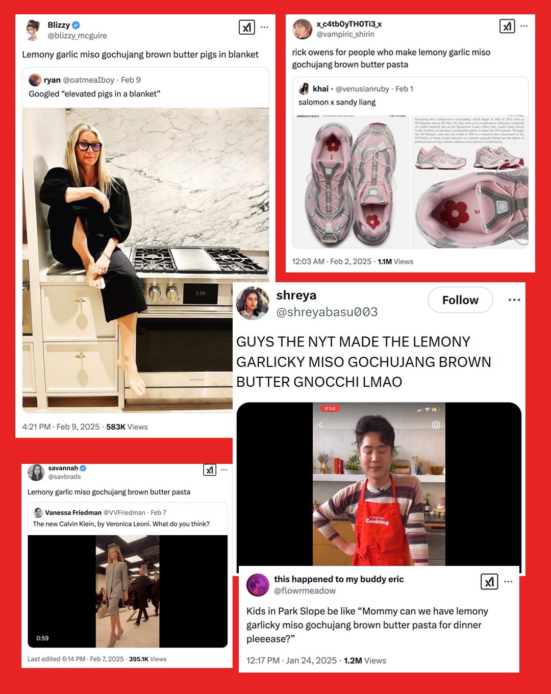 It’s important to remember that media has always influenced what people cook (think about TV chefs, or recipes in newspapers), and that ingredients always go through phases of trendiness, so there’s an element of this that really isn’t that deep. But on the other hand, the lemony garlicky miso gochujang meme is kind of a fascinating window into what the internet deems cool, the way it divorces things from their original contexts and drives them towards new meanings, and, crucially, how it internet entirely now shapes many people’s lifestyles to every degree.