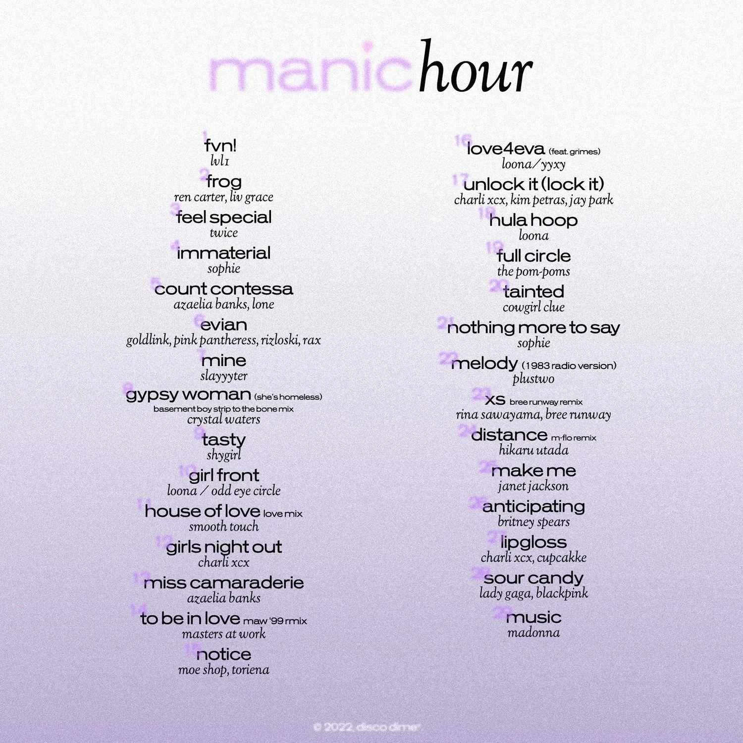 I love music and I am an avid playlist curator and listen to a ton of different types of genres and artists and I have recently discovered how helpful curated playlists based off vibe or mood helps with mood regulation. This new playlist series will all feature only fem / fem POC / fem LQBTQ+ artists. I have noticed that a lot of the main "indie" playlists that Spotify pushes like "Pollen" for example, are all predominantly male artists, despite its claim of being "inclusive and underground" artists. First up, I have my 'manic hour' playlist that evokes a really high energy, empowered vibe that features everything from house, to rap, to dance, to k-pop, to hyperpop.