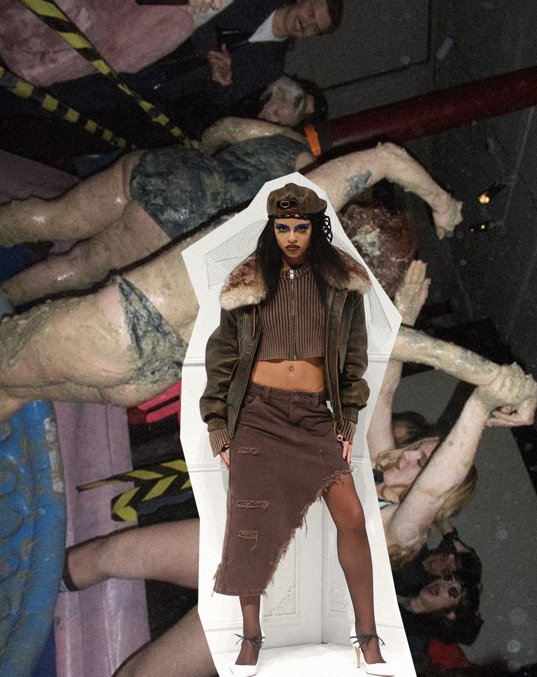 Still, much of this happens in the city, where it is inevitably upended by interactions with ‘tastemaking’ circles, in more ‘elite’ spaces. It is in these circles where subversion becomes more illusory, working with mechanics already approved by those higher-up. Urbanisation also means that dirt becomes more than simply what grows in the ground; even mud can be artificially created. Dirt becomes mess, the accumulation of materials, trinkets, lesions. AW24 runways have displayed interest in intentional distress, frays, meshes, swallowing silhouettes. Dirt becomes something that can be constructed, emulated (thereby making its constructions constructible) and sold.
