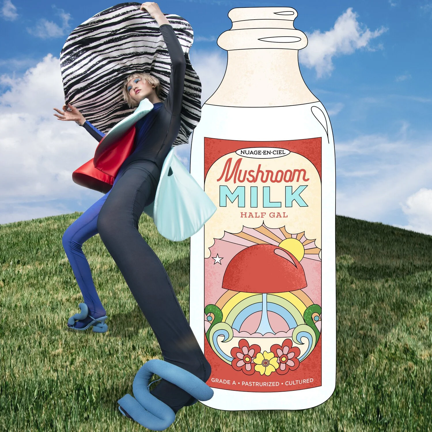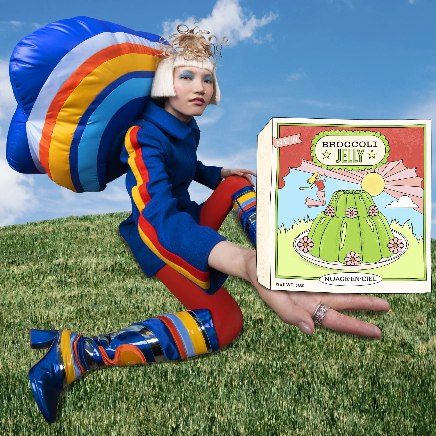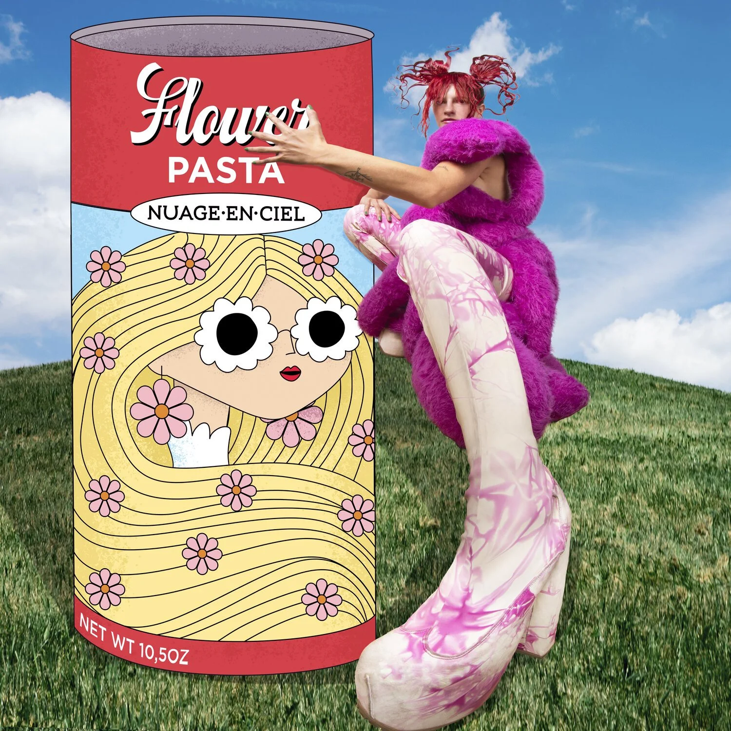 The inspiration for this story came from the movie "The Greatest Showman" and specifically from a very short scene where the circus poster gets stuck on a milk bottle to advertise their show; that was when I (Alma Rosaz) knew this would be the idea for our collaboration. The name "Nuage-En-Ciel" came from the main red thread present in my work - the blue sky filled with clouds. We then decided to create very quirky food products - such as the fish lollipop - in order to make the story very kitsch and 'out there', which is what we aim to achieve through our respective works. The food products were designed and illustrated by Chloe Azulay in Bangkok, Thailand, and the shoot and editing was done in London, UK by Alma Rosaz.