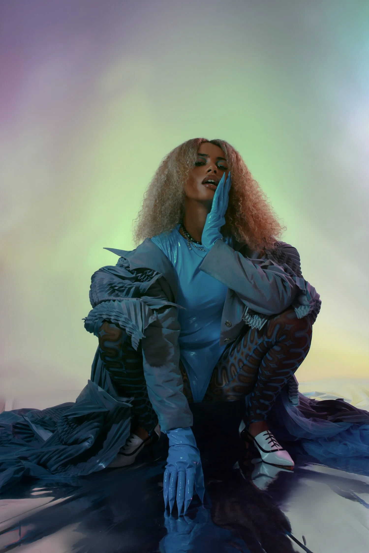 LOOK 6 AND 14: Blue body, Coat: Anastasia Bull | Necklace: YUSUKI | White shoes : AJOY SAHU