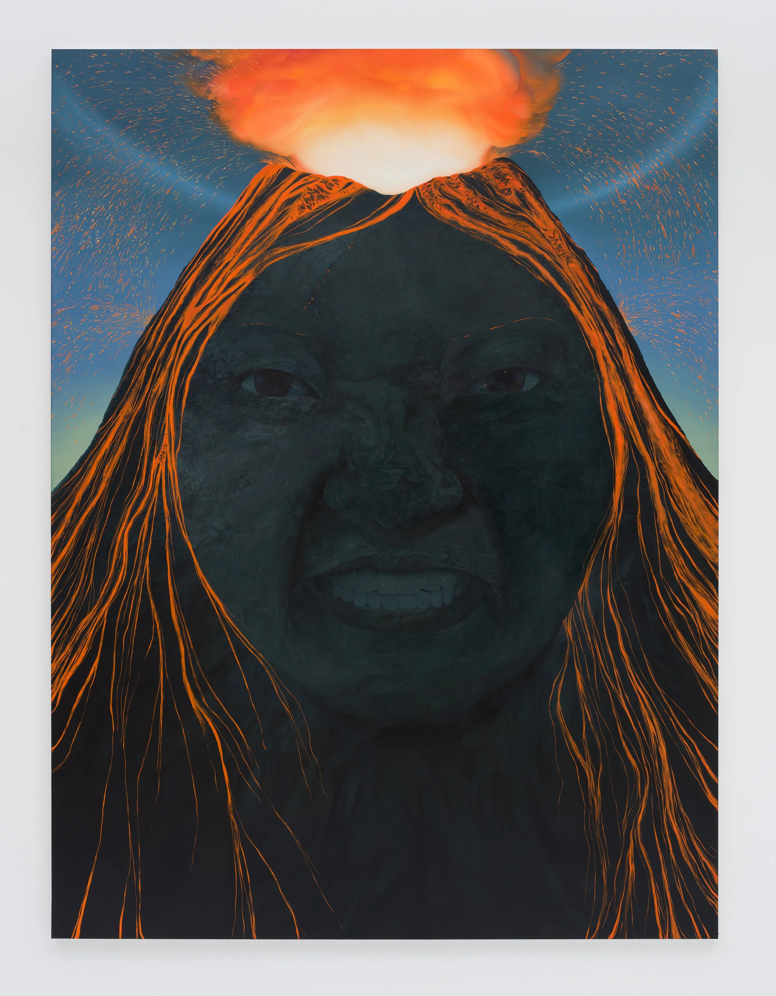 At her London show, Gordon’s explorations of the body arise from absence and metamorphosis. We see Gordon’s body transform into plants, animals and mountains. However, Gordon is always thinking of how to make her soul recognisable, even in foreign terrain – you see her mischievous spirit pop out in the glint of a tabby cat’s eyes as it perches forward playfully, its claws entangled in pink yarn, its tongue pushing forward seductively behind its canines. Elsewhere, Gordon’s face is the centre of an erupting volcano: white blistering lava set against rocky borders that crack and contour her face, thousands of years of pent-up energy on the edge of rupture.