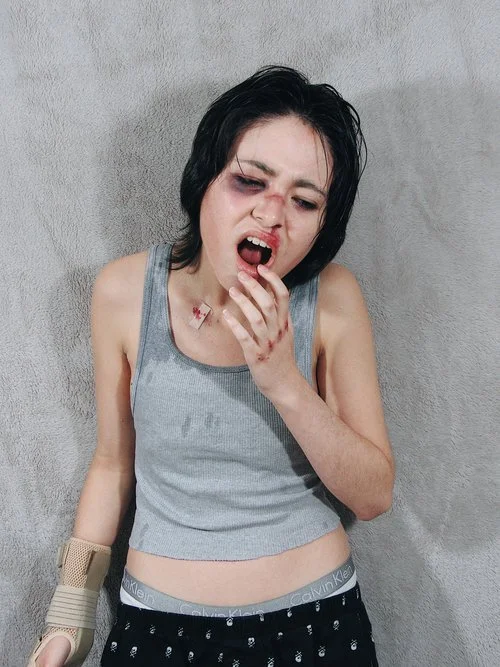 “In my Trading Cards series, I embody five made-up characters: (1) Amber Vaughn, a west coast diva from the early aughts; (2) Antonio Tex, a troubled boxer; (3) an extraterrestrial party-alien; (4) Elle Jones, a warehouse rave regular; and (5) Joey Belvedere, an eighties Blitz Kid.