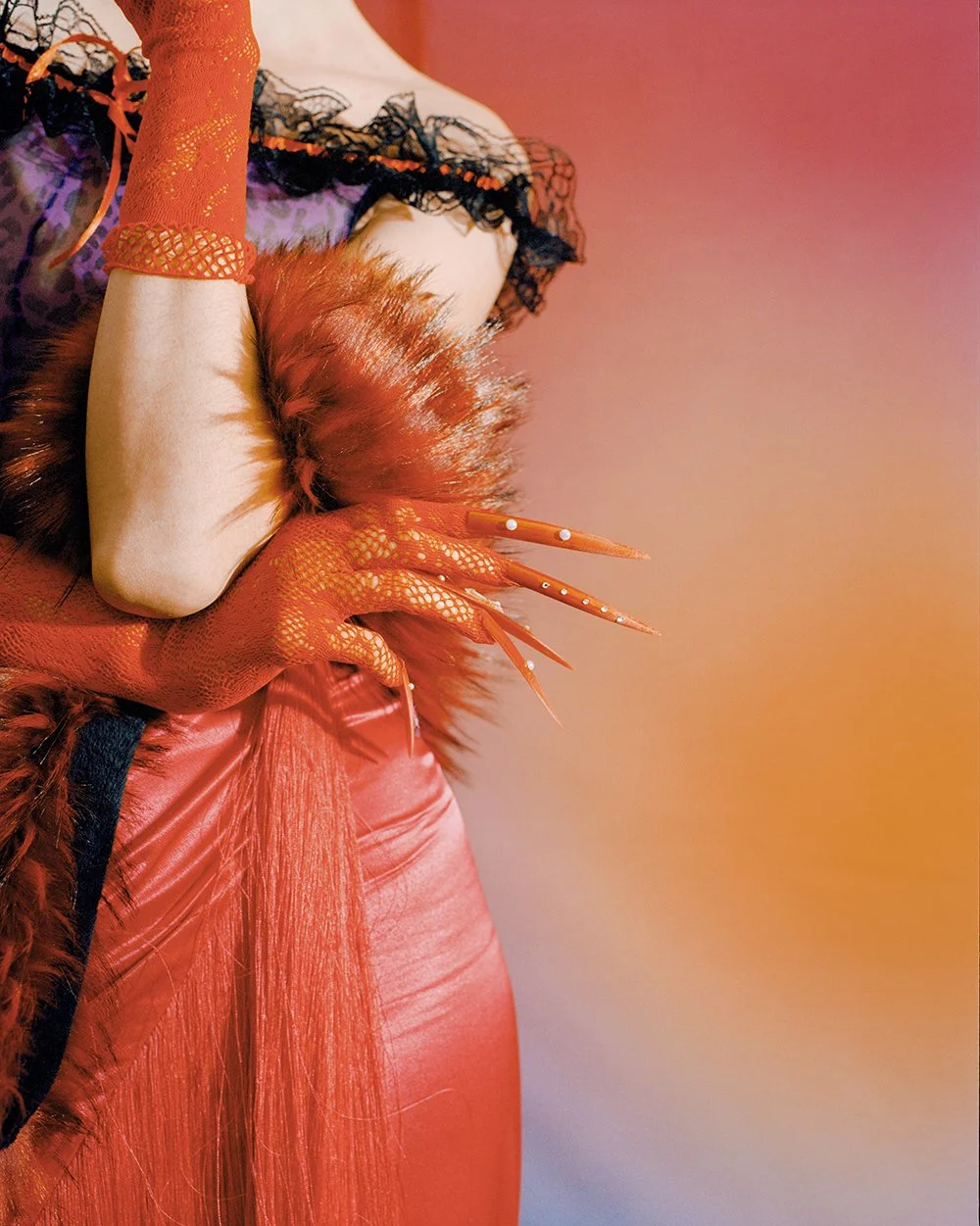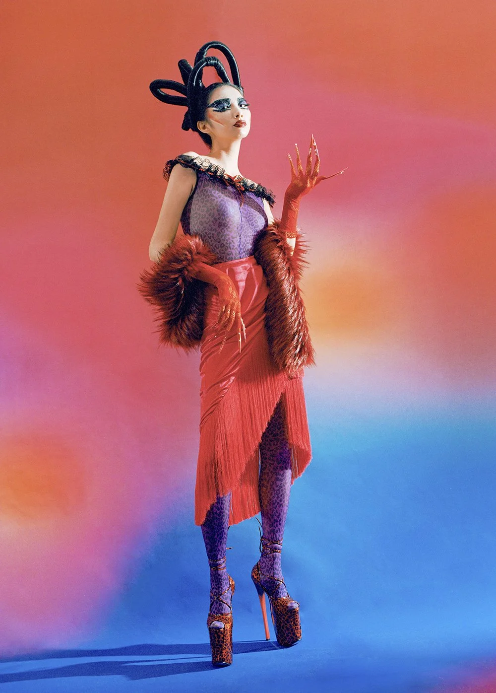 The character in my editorial is representative of Wu Zetian as well as women in modern society. I put traditional costume elements together with feminine elements to create an anti-traditional “slut” image, She is strong and powerful and she wears whatever she wants.